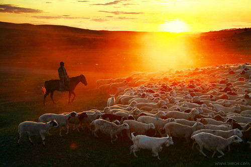 夕阳里逆光会给羊群打上漂亮的轮廓光,扬起的烟尘在逆光呈现漂亮的暖色,加强了色彩和氛围。