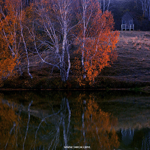 幽深神秘,也是秋天的一种特有气质,要表现这种气质,画面里故意纳入了一池秋水,红树的倒影,还有树林中的小木屋,都为画面增添了一层神秘感。