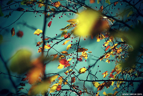 秋叶的拍摄也可以用另外一种方式,让充满生命动感的枝条和多彩的红叶充满整个画面,在高旷的天空里绽放出生命的乐音。
