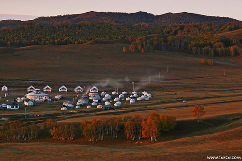 夕阳里蒙古包冉冉升起的炊烟,呼唤着牧归的羊群和牧人。