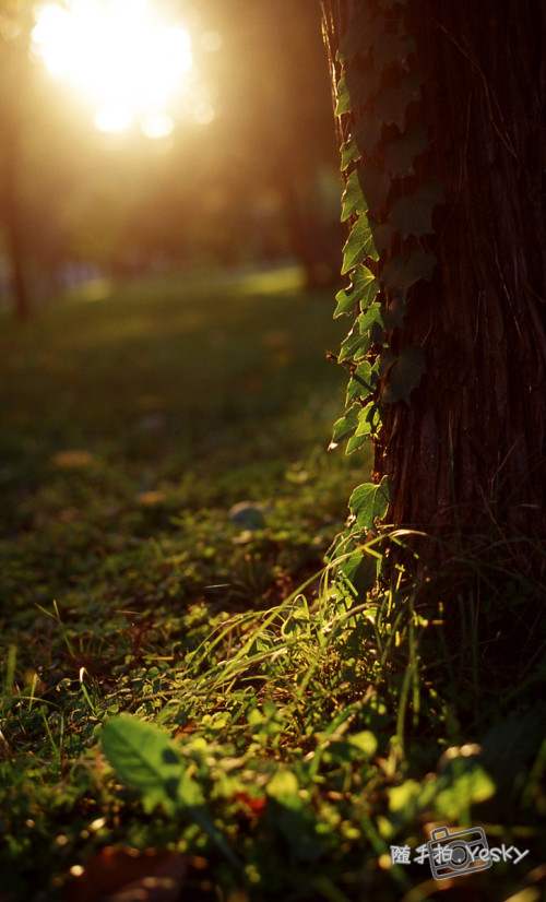 将太阳放置于画面的右上或者左上角是常用的构图法,我发现了树干上一支缠绕的花草,于是将它收入画面中。这张照片是用胶片拍摄的,所以整体色彩更为鲜明浓郁,不过这丝毫不妨碍我们对于摄影技巧和拍照理念的探讨,用数码相机也能拍摄出同样的效果。