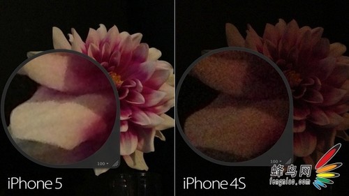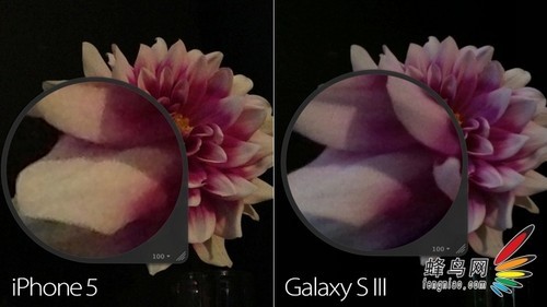 接下来轮到了iPhone 5与三星Galaxy S3做拍摄对比了。在低光照条件下拍摄,Galaxy S3的拍摄画质比iPhone5更清晰,噪点相对更低,并且Galaxy S3还正确的表现了花瓣的颜色。