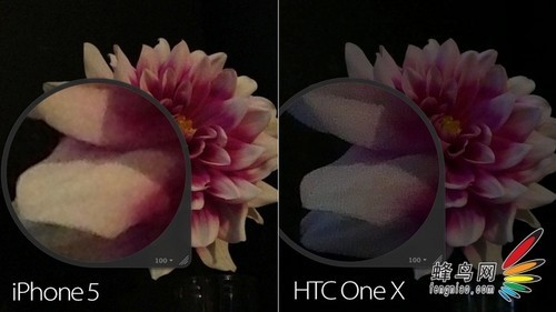 在暗光拍摄环境下,HTC One X与三星Galaxy S3一样,花朵的颜色表现都比iPhone5好,但是HTC One X所拍摄的画面中显示许多噪点,让HTC One X的画面变得很糟糕。如果两者来比较,反而iPhone 5的画面较能被接受(虽然两者都不够好)。