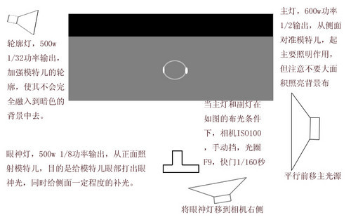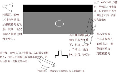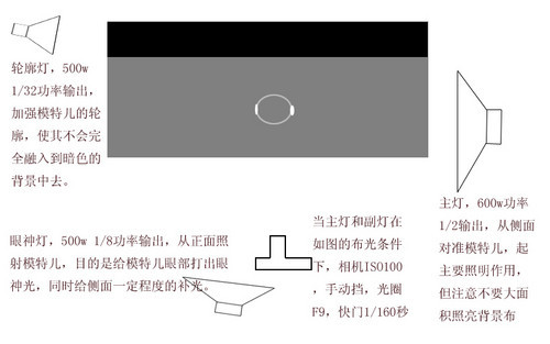 这是一个典型的低调人像的布光方法,注意图中给出的参数,这是影室灯的用法,如果我们没有影室灯,那么,用外置闪光灯也是可以的,只不过外置闪光灯功率相对比较小,这时候,我们可以提高ISO,放大光圈,都可以达到差不多的效果。