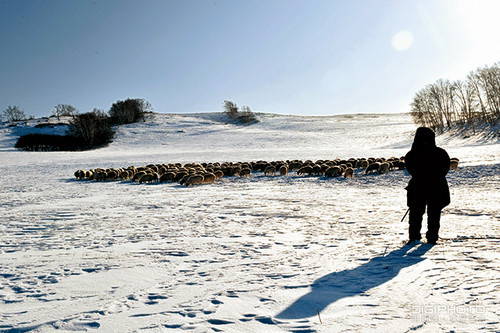 光圈F11,速度1/500s,焦距125mm,ISO 200。羊群、稀树、雪地是互相映衬的。