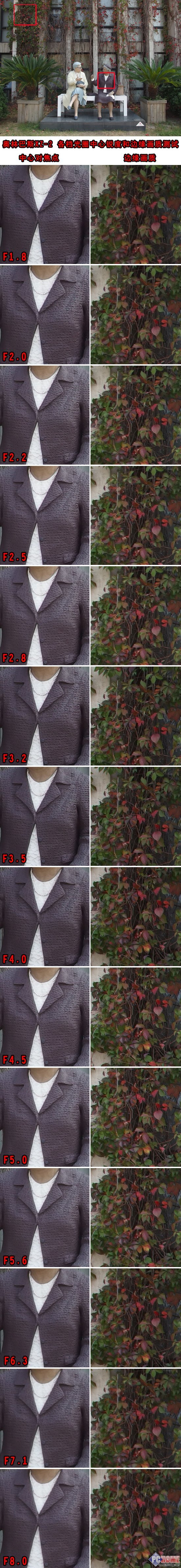 接下来我们进行一下各档光圈 中心锐度及边缘画质测试,首先测试地点我选择在自然光线下,变焦至1.2倍左右,焦段为35mm人眼视角进行测试,红色区域为中心对焦点,从我测试下来的结果来看,F1.8至F2.8时,中心点锐度相对较低,但是F2.8的边缘画质明显要好与F1.8,接下来将光圈开至F3.2至F5.0,此时画质中心的锐度处于最高峰,边缘树枝枝干的细节画质也保留的非常完美,F5.6至F6.3此时处于该画质的一个风水岭,不严苛的说画质还算勉强可以接受,但是F7.1至F8时画质开始直走下坡路,雕像老奶奶衣领上的颗粒细节已经完全尽失,相比最大光圈F1.8还要较肉。