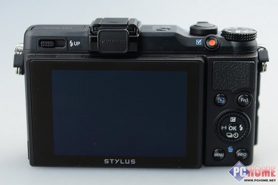 奥林巴斯XZ-2的机身背面采用一块3.0英寸的可翻转液晶屏,约92万像素,在拍摄时可以使用触摸快门进行拍照,机身上方左侧的就是闪光灯开关按键,左右切换为开启方式,机身右侧大拇指处配有防滑胶皮,下面的操控按键会在下一节重点介绍。