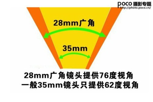 广角镜头最明显的优点,就是可以在近距离内拍下更多的元素。因为焦距的不同,所能拍摄的视觉角度也不同。50mm的标镜视角有46度,而35mm视角62度,28mm视角76度,18mm的更是有超过100度的视角范围。