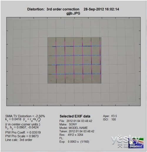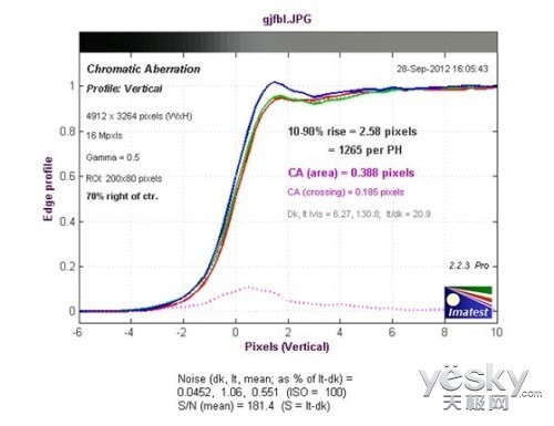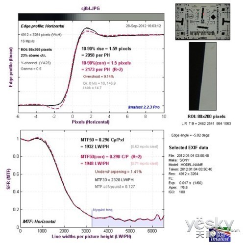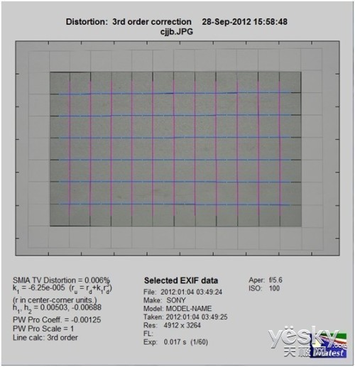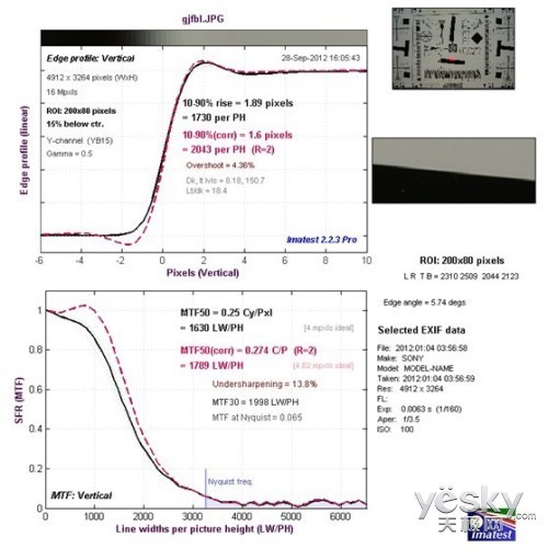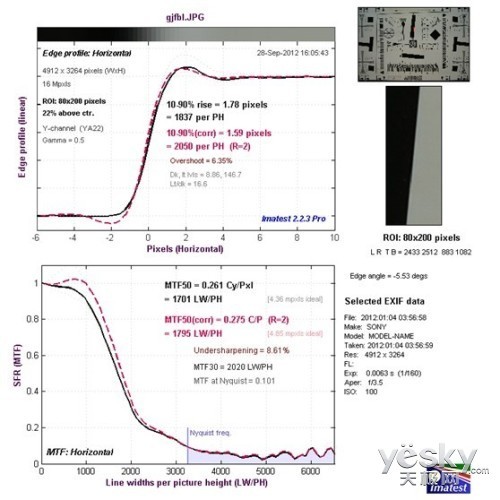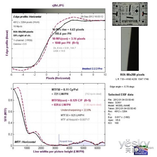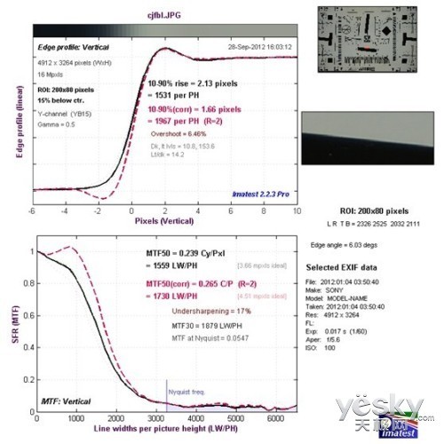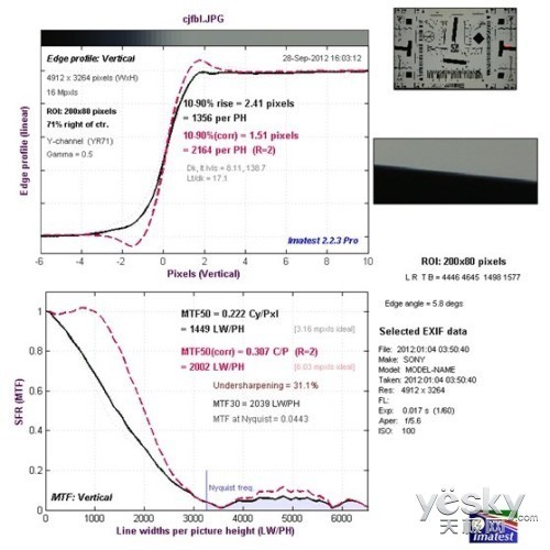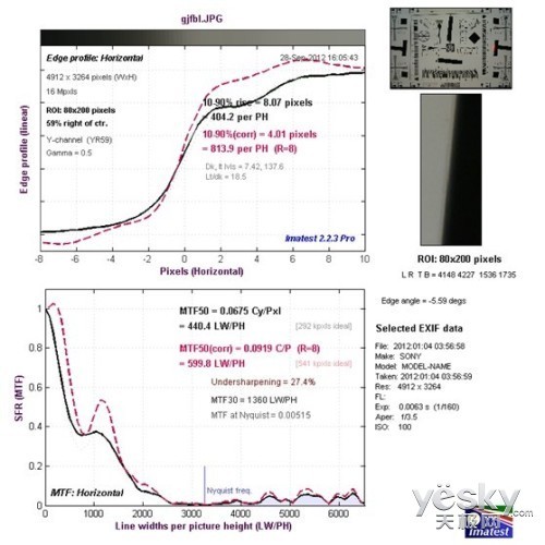 我们使用Imatest对本次评测所使用索尼NEX-6的分辨率与色散情况进行了测试,大家可以将测试所得的分辨率结果与上图标准进行比对,从而获得直观而明确的参考。