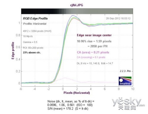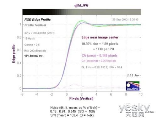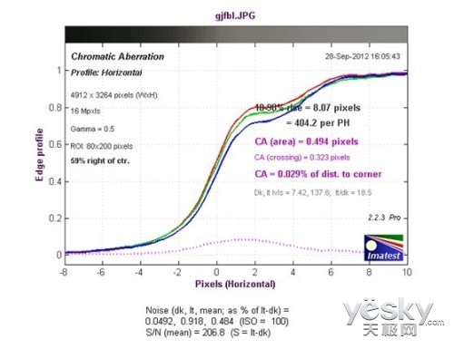 我们使用Imatest对本次评测所使用的索尼NEX-6的分辨率与色散情况进行了测试,大家可以将测试所得的分辨率结果与上图标准进行比对,从而获得直观而明确的参考。