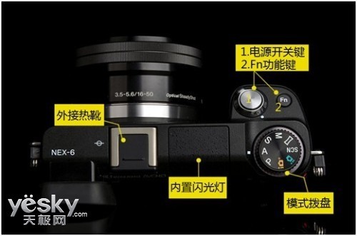 来到索尼NEX-6机身顶部,我们发觉这次NEX-6的闪光灯热靴不再是索尼独有的热靴,而换成了通用型热靴,这样大大方便其他摄影附件的连接,而模式拨盘和电源开关附近的Fn键,则体现了索尼NEX-6作为准专业相机的定位。