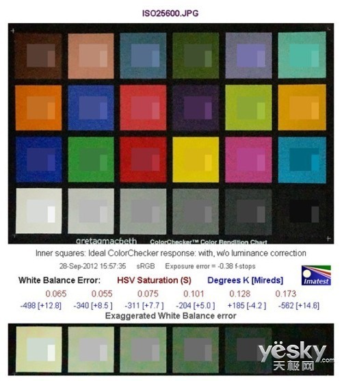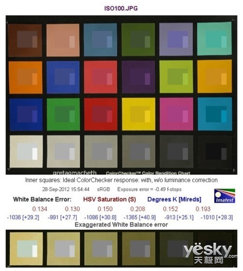 白平衡偏移方面,曝光值误差在-0.49,白平衡没有偏移。白平衡方面,色温5500K的光照环境下,ISO 100时的偏移还不错,最高处为0.208,色温偏移数值为-1368,白平衡偏暖。