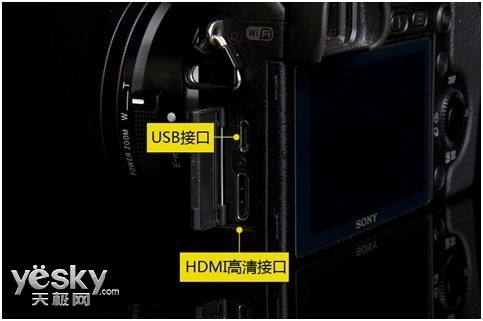在索尼NEX-6机身一侧分别是HDMI高清接口和USB数据接口。索尼NEX-6支持1080p高清视频,HDMI高清接口为视频分享提供了方便,而USB接口除了普通的数据传输外,更有充电的作用,不用再担心外出时找不到匹配的电源而烦恼。