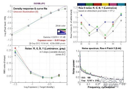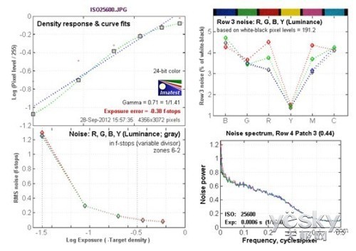 ISO 16000的最高噪点值为1.28左右,噪点控制得还不错。从Row 3 noise:R,G,B,Y(Luminance)图表中可以看到,在蓝色上是以绿色通道的噪点为最多,达到4.8左右。红色上是以红色通道的噪点为最多,达到4.7左右。绿色通道的噪点最高值出现在红色上,达到3.8左右。