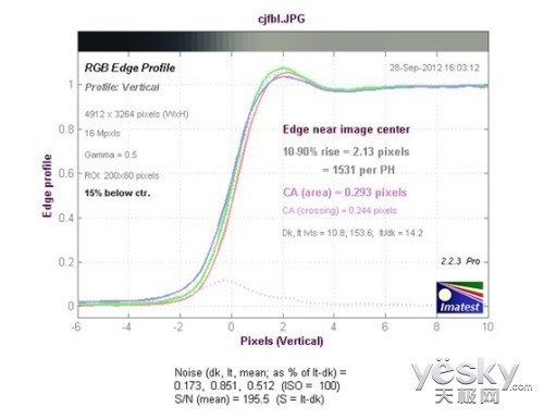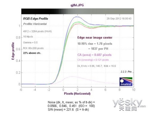 从边缘水平分辨率测试的结果看,分辨率达到了599.8LW/PH,没有达到一般水平,机内进行了一定的锐化,出现了驼峰现象。