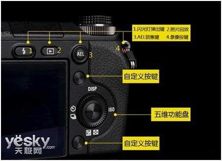 在索尼NEX-6液晶屏的一边是功能操作区域,分别有内置闪光灯弹出、图像回放、AEL锁焦、五维功能盘及功能按键等。我们特别注意到,这次索尼NEX-6的录像按键被安排在手柄转角处,离其他按键都相对较远,这样的安排可以有效避免误操作而造成的损失。