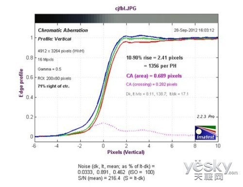 从长焦端边缘垂直方向色散测试结果来看,色散区域为0.689像素,蓝色通道的色散高于其他通道。