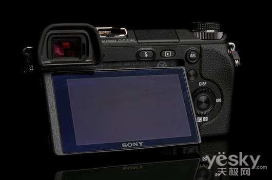 接着来看索尼NEX-6的机身背部,NEX-6此次搭载的是约92万像素的可折叠式Xtra Fine液晶屏,NEX-6液晶屏最大可向上折叠与机身平面呈约90°角,向下呈约45°角,提高了实景拍摄的多样性和便利性。与NEX-7相同的是索尼NEX-6也内置了XGA OLED Tru-Finder电子取景器,OLED技术提供了高对比度和分辨率,使得画面清晰明亮,并且由于取景器的超薄尺寸,使得33.1°宽广的视角、 距目镜23.3mm的舒适眼距和明亮的100%视野率成为可能。