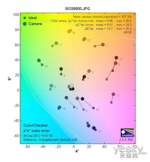 从ISO 25600时的色彩偏移的情况看,索尼微单NEX-6的色彩饱和度为107.3%,最大偏移量为20.5。红色区域的色彩偏移相对较大。