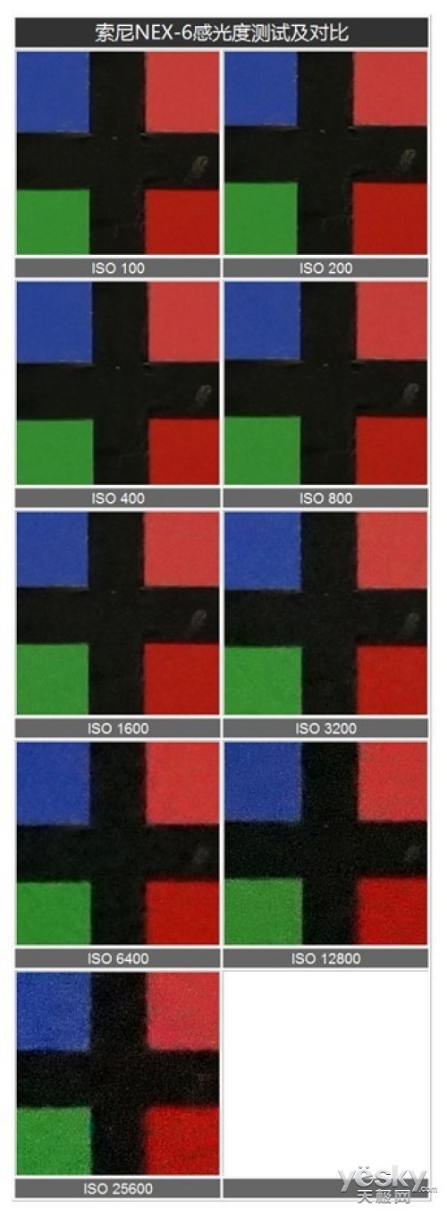 从测试结果来看,在ISO处于100到1600时,索尼NEX-6的表现相当不错,ISO上升至3200到25600时噪点开始增多,所以大家在夜晚或暗光情况下应该注意拍摄的效果。