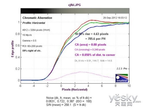 从长焦端中心水平方向色散测试结果来看,色散区域为0.21像素,蓝色通道的色散高于其他通道。