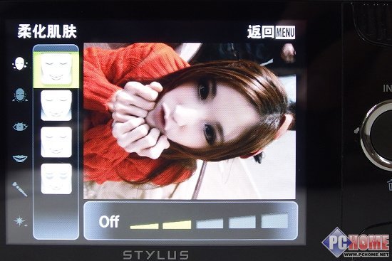 进入脸部完美修正栏后,可以对脸部进行柔化肌肤、纤瘦面孔、眼睛放大、嘴唇颜色、眼线以及柔焦效果的修改,并且每一档都可以按照自己的需求进行递增和递减,分类非常之细,这一点目前没有哪个影像厂商可以做到。