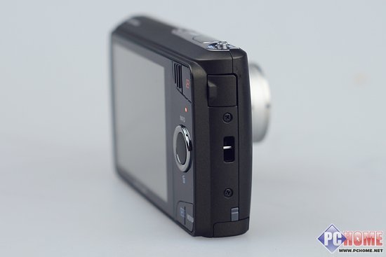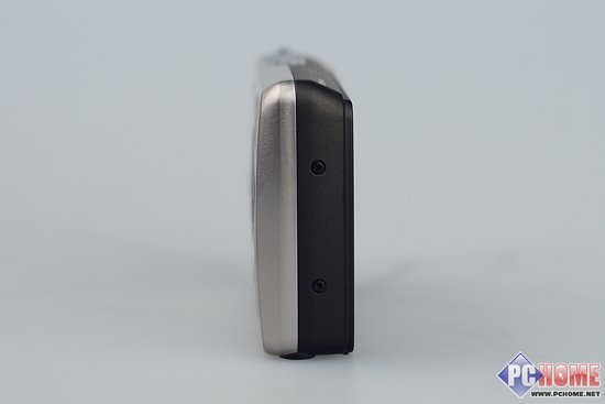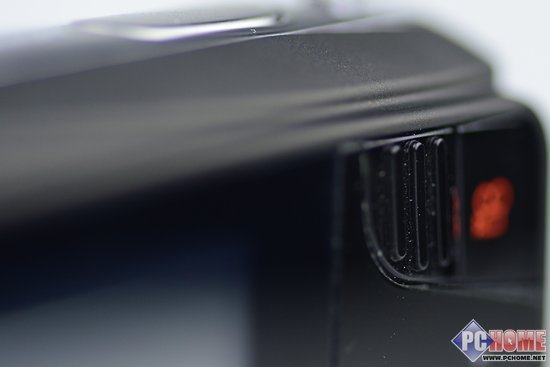 从奥林巴斯VH-410的机身右侧看,采用工程塑料咖啡色拼色包边,并配有手提挂绳穿口。
