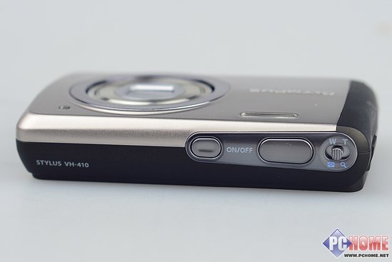 奥林巴斯VH-410机身顶部比较的简洁,从左到右是开关机按键、快门按键,和变焦拨杆。