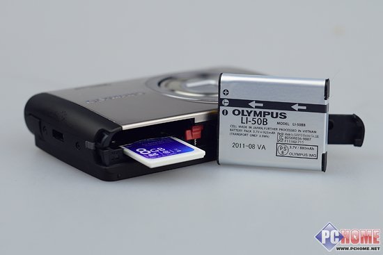 奥林巴斯VH-410机身底部配有电池槽和SD存储卡槽开关,该机电池型号为LI-50B、并具备880毫安的电池容量。