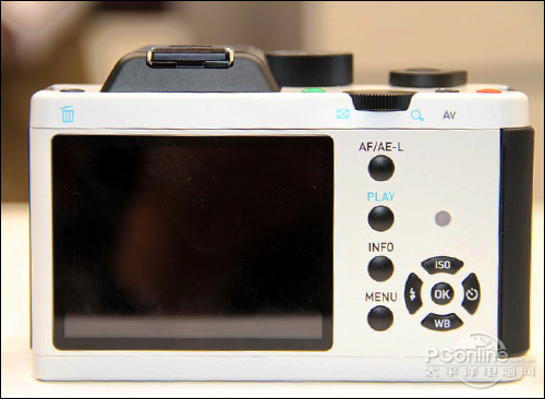 机身背面最显眼的当然是硕大的液晶屏幕,再加上为数并不多的按钮,看上去和尼康1系有点相似。上方有一个多功能转盘,实现与单反相机类似的操作方式。并可以快速实现缩放等功能。宾得K-01搭载3英寸92.1万像素的显示屏,在单电相机当中属于配置较好的。