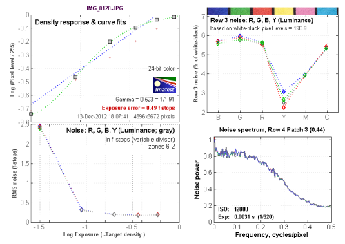 ISO 12800的最高躁点值为2.5左右,有非常明显的噪点。从Row 3 noise:R,G,B,Y (Luminance)图表中可以看到,在蓝色通道上是以蓝色的噪点为最多,达到5.8左右。 红色通道上是以绿色的噪点为最多,达到5.7左右。绿色通道的噪点最高值出现在蓝色上,达到6.0左右。