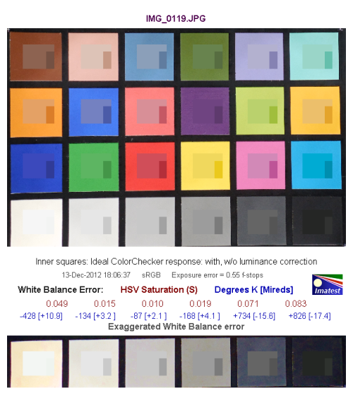白平衡偏移方面,曝光值误差在0.55,曝光很准确。白平衡方面,色温5500K的光照环境下,ISO 160时的偏移,最高处为0.083,色温偏移数值为+826,白平衡偏冷。