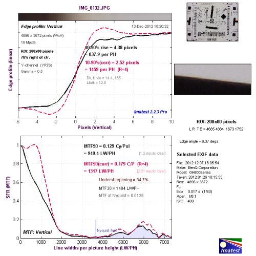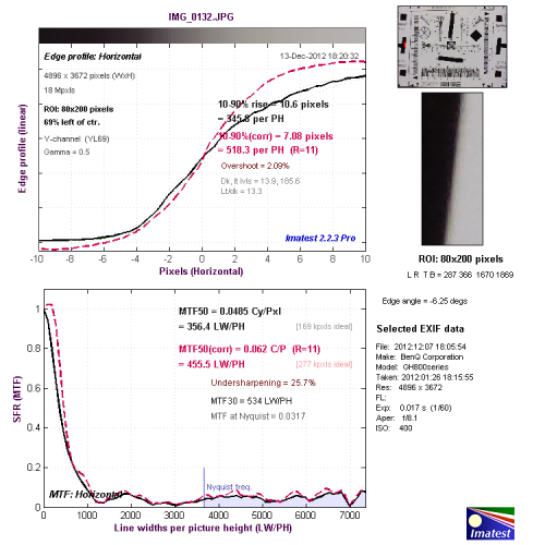 从边缘垂直分辨率测试的结果看,分辨率达到了455.5LW/PH,机内进行了一定的锐化,出现了驼峰现象。