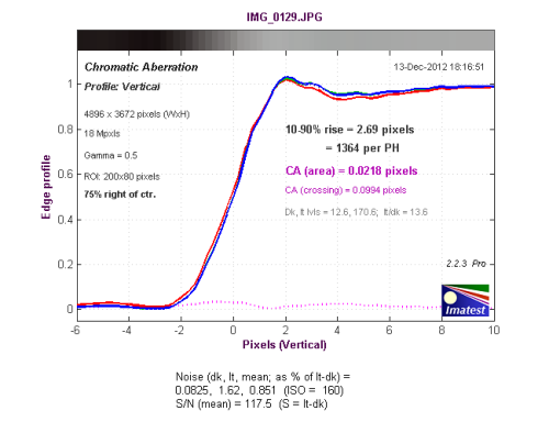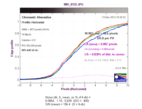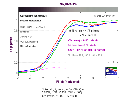 从长焦端边缘垂直方向色散测试结果来看,色散区域为0.807像素,红色通道的色散略高于其他通道。
