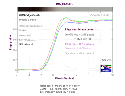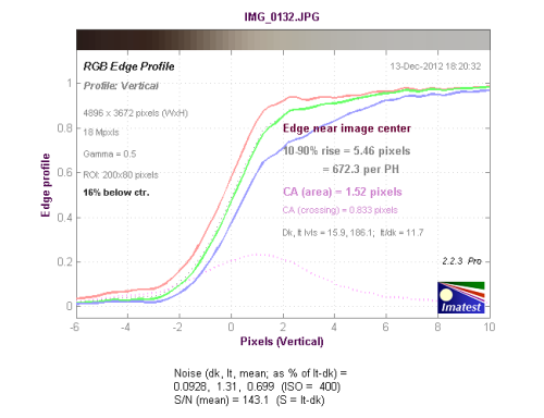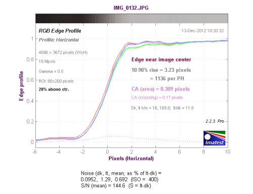 从边缘水平分辨率测试的结果看,分辨率达到了1317LW/PH,达到了好的水平,机内进行了一定的锐化,出现了驼峰现象。