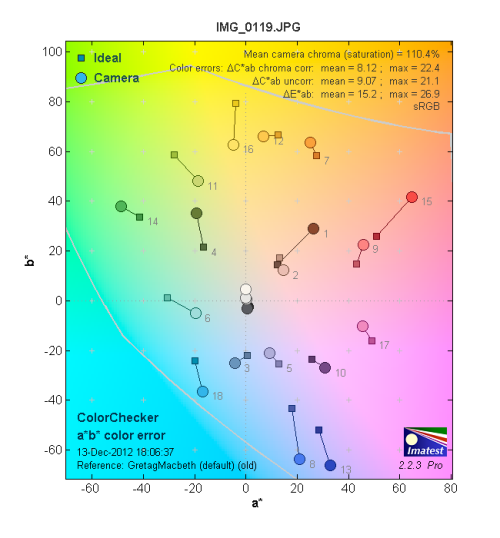 从ISO 160时的色彩偏移的情况看,明基GH800的色彩饱和度为110.4%,最大偏移量为22.4。紫红色和冰蓝色区域的偏移较大,其它色彩虽有偏移但都不大。