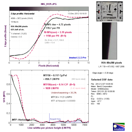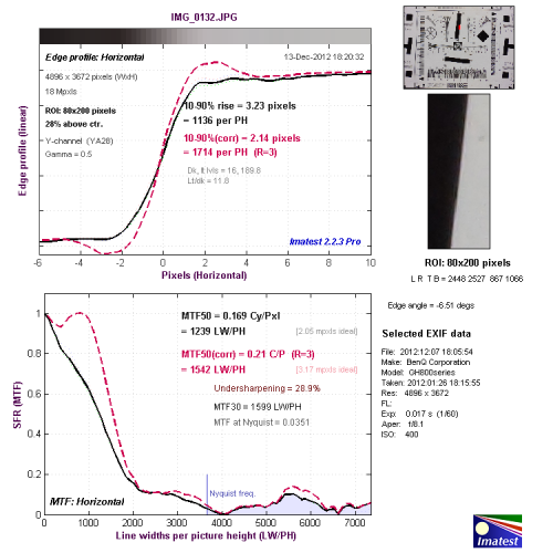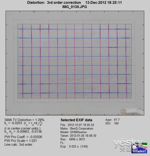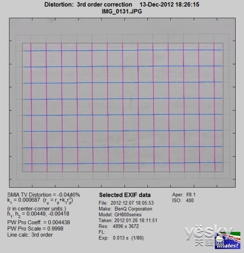 我们使用Imatest对本次评测所使用明基GH800的分辨率与色散情况进行了测试,大家可以将测试所得的分辨率结果与上图标准进行比对,从而获得直观而明确的参考。