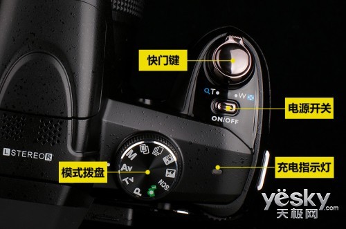 接着来看明基GH800机身肩部,有着与单反相机类似的按钮设计安排,快门变焦杆、开关电源按钮及模式拨盘。相信熟悉单反相机的网友会更易上手,当然明确的功能键安排使初学者也很容易学会操作。