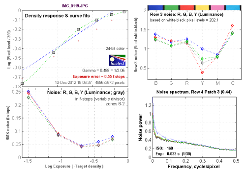 ISO 160的最高躁点值为0.25左右,属正常情况。从Row 3 noise:R,G,B,Y (Luminance)图表中可以看到,在蓝色上是以蓝色通道的噪点为最多,达到1.4左右。 红色上是以蓝色通道的噪点为最多,达到1.3左右。绿色通道的噪点最高值出现在红色上,达到1.2左右。