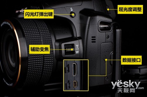 明基GH800在数据端口上新增了一个HDMI接口,使得高清传输功能能够实现。这样相机就能可以直接连在电视或高清设备上观看图像和视频了。在镜头的边上还有一个辅助变焦功能,这样的设计就能彻底解放右手来实现变焦,在使用上更加合理。