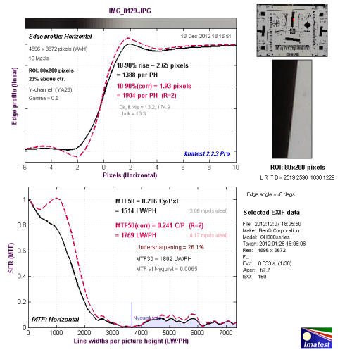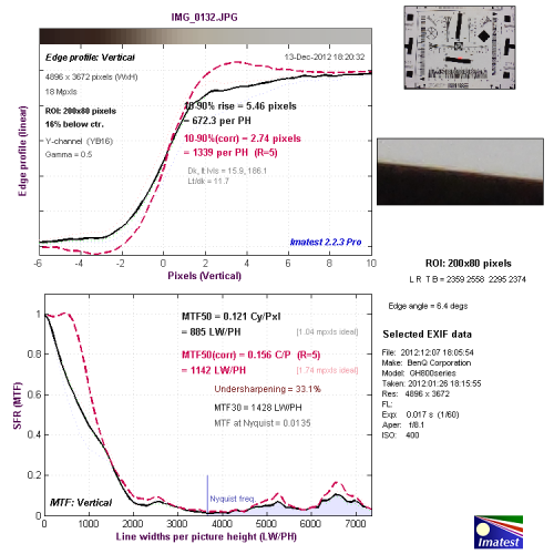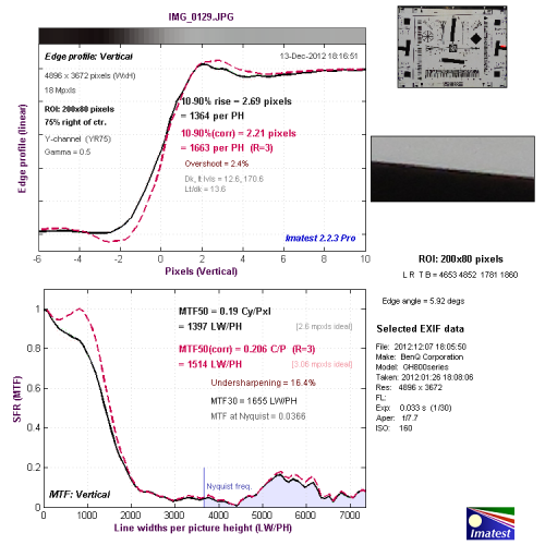 从边缘垂水平辨率测试的结果看,分辨率达到了1514LW/PH,达到了较好的水平,机内进行了一定的锐化,出现了驼峰现象。
