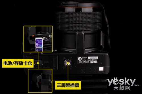 我们最后再来看看,明基GH800数码相机底部的设计情况。这里分别是常规的电池/存储卡仓以及三脚架插槽的设计,方便实用,电池容量为1700mAh,保证了相机有一定的续航能力。