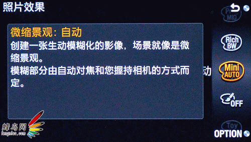 索尼NEX-6相机的照片效果方面,包含了微缩景观、柔亮光调、玩具相机、复古、柔焦、丰富色调黑白、HDR绘画等多种效果可供选择,并且大部分照片效果可通过OPTION键进行程度、效果调节。