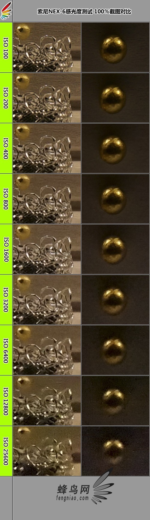 前面说了很多NEX-6同NEX-7相似的外表及操控体验,本页来看下NEX-6同NEX-5R相近的内在。同NEX-5R一样,NEX6也采用了1610万像素CMOS传感器,感光度范围为ISO100-ISO25600。以下感光度测试,笔者采用固定机身,光圈快门模式,延迟拍摄,100%截图的形式,让我们看下其表现如何。