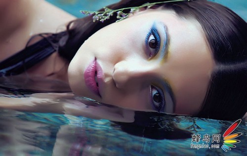 拍摄人物面部特写时,使用大光圈可以尽量虚化掉与主题无关的景物。如本作品中,背景中的蓝色池水,甚至是模特的肩膀和颈部的头发与肩膀的泳衣。但过大的光圈不但会虚化掉背景,也会影响到模特鼻尖的清晰效果(对焦点选择在眼睛的情况下)。因此,作者选择了光圈f/5.6,清晰的景深涵盖了人物迷人的眼睛和性感撅起的嘴唇,而从耳朵的花蕾处开始迷人的虚化,直至肩膀。人物的神态极为突出。