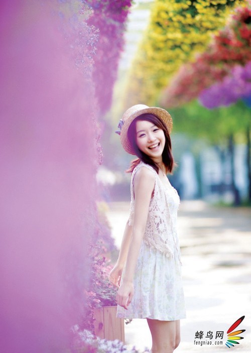 作者运用虚化的花丛作为前景,以晕染、扩散的方式,为画面增加了水粉画的效果,值得借鉴。注意在画面中要保留一定比例的暗调景物,如人物的黑发和暗黑的树干,以增加作品的沉稳性。路面的高光部分,极易过曝形成亮斑,在前期可以利用诸如“高光色调优先”之类的功能,予以最大的保留。