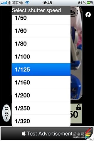 Pocket Light Meter的工作原理十分简单,通过iPhone背后摄像头进行测光,计算出拍摄时所需的感光度、快门速度和光圈数值。使用时,可以用通过触摸屏移动画面中的红框,选择合适的测光点,进行测光计算。在测光中,分别从左到右显示快门速度、光圈数值、感光度。测光数值确定后,可以按住“HOLD”将曝光数值锁定。