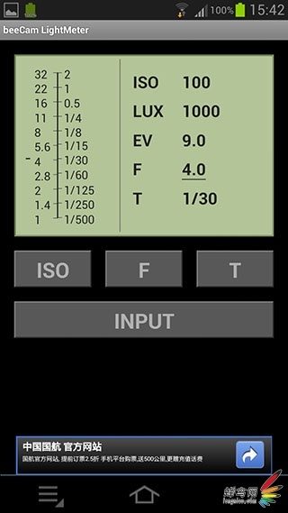beeCam LightMeter通过设置选择预先需要的曝光组合,然后点击INPUT进行测光操作。使用方便,依然利用手机背后摄像头进行测光,是一款比较专业的测光表软件。