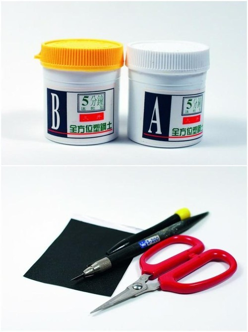 需要用到的工具:小剪刀、螺丝起子、小尖刀片、塑钢土、黑色胶布、小锯子和塑钢土AB两剂