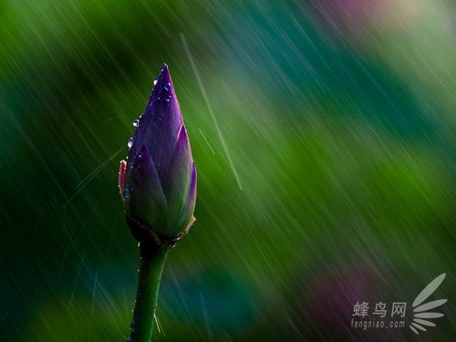 由于光线的变化较大,最好在拍摄时对主体部分进行测光。如果遇到雨中转晴的情况,采用逆光或侧逆光,可以有效的提亮雨滴,表现出雨水的立体感。